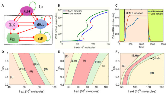 First, we calculated a bifurcation diagram of ZEB1/2 mRNA levels in response to an external EMT-inducing signal I_ext, which can represent various possible intracellular/extracellular stimuli that can drive EMT (Figure 1B). The ZEB1/2 mRNA levels served as a readout of the EMT phenotypes. We observed that, with an increase in the levels of I_ext, the cells could switch from an epithelial state (ZEB1/2 mRNA < 100 molecules) to a hybrid E/M phenotype (100 < ZEB1/2 mRNA molecules < 600) and, finally, to a mesenchymal state (ZEB1/2 mRNA > 600 molecules). This behavior was observed both in the absence of KLF4 (curve with a green solid line and black dashed line in Figure 1B) and in the presence of KLF4 (curve with a blue solid line and red dashed line in Figure 1B), and the bifurcation curves looked similar in shape. However, in the presence of KLF4, we observed that the system required a stronger EMT signal to be pushed out of an epithelial state and, also, for the acquisition of a completely mesenchymal state (i.e., the bifurcation diagram in the presence of KLF4 was shifted to the right as compared to that of the core network without KLF4). This observation suggests that KLF4 can inhibit the progression of EMT.