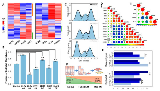 KLF4 promotes an epithelial phenotype. (A) (Left): Heatmap showing the steady-state values of all the components of the KLF4–EMT-coupled circuit, obtained across the parameter sets simulated by RACIPE. (Right) Same as the left panel but for KLF4 overexpression. (B) Change in the fraction of the epithelial phenotype due to the simulated overexpression or downregulation of either KLF4 or ZEB1 or SLUG. Error bars for n = 3 independent simulations. (C) Frequency density of the epithelial, hybrid, and mesenchymal phenotypes obtained using the EMT scores. (Top) KLF4 circuit, (middle) KLF4 circuit with KLF4 down-expression (DE), and (bottom) KLF4 circuit with KLF4 overexpression (OE). (D) Pairwise Pearson’s correlation matrix. (i) Correlation of the epithelial and mesenchymal players and EMT scoring metrics (76GS, KS, and MLR) in the CCLE cell lines. (ii) Correlation of the RACIPE-simulated expression values of the nodes in the KLF4 network. Squares indicate a p-value > 0.01. (E) Change in the size of the epithelial and mesenchymal clusters upon OE and DE of GRHL2 and KLF4. (F) Schematic showing the variations of the KLF4, GRHL2, ZEB1, and SNAIL levels across the EMT spectrum. **: p < 0.01.