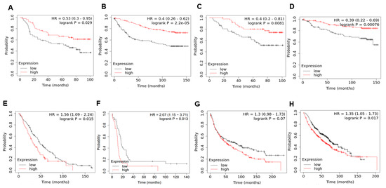 To determine the effects of KLF4 on clinical outcomes, we investigated the correlation between KLF4 and patient survival. We observed that high KLF4 levels correlated with better relapse-free survival (Figure 5A,B) and better overall survival (Figure 5C,D) in two specific breast cancer datasets—GSE42568 (n = 104 breast cancer biopsies) [69] and GSE3494 (n = 251 primary breast tumors) [70]. However, the trend was reversed in terms of the overall survival data (Figure 5E,F) in ovarian cancer—GSE26712 (n = 195 tumor specimens) [71] and GSE30161 (n = 58 cancer samples) [72] and lung cancer (Figure 5G,H)—GSE30219 (n = 293 lung tumor samples) [73] and caArray (n = 504 samples) [74], where high KLF4 levels correlated with worse patient outcomes.