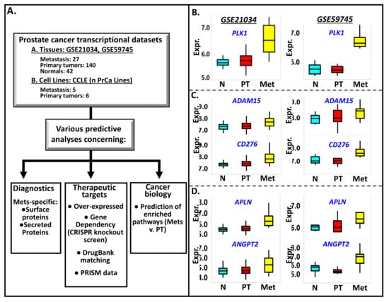 (A) The scheme on how integrated analyses of publicly available genomic and pharmacological data, gene/protein annotations, and pathways analytical tools are employed to identify potential diagnostic markers, therapeutic targets, and relevant biology associated with prostate cancer metastasis. Examples of genes found to be highly expressed in prostate cancer metastasis (Met) relative to primary tumors (PT) and normal prostate tissues (N) are PLK1 (B), ADAM15 and CD276 (C), APLN and ANGPT2 (D). CD276 and ADAM15 code for surface-bound proteins while ANGPT2 and APLN code for secreted proteins. The Met v. PT p-values for each of these genes are (GSE21034 and GSE59745, respectively): PLK1 (0.002, 0.002), ADAM15 (0.002, 0.14), CD276 (0.002, 0.004), APLN (0.002, 0.03), and ANGPT2 (0.008, 0.002). On the other hand, the PT v. N expression levels of the aforementioned genes are not statistically significant, with the following p values (GSE21034 and GSE59745, respectively): PLK1 (0.25, 0.71), ADAM15 (0.09, 0.69), CD276 (0.38, 0.92), APLN (0.06, 0.74), and ANGPT2 (0.57, 0.16).