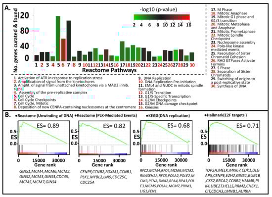 The genes CENPF, TPX2, EXO1, HJURP, and TOP2A, play pivotal roles in chromosome segregation, mitosis, and DNA replication. PLK1 is a serine/threonine kinase gene involved in mitotic regulation [32]. The top 500 genes with the highest signal-to-noise ratio (SNR; metastasis vs. PT) were subjected to Reactome over-representation analysis. Results indicated that the pathways with the lowest P score (i.e., most likely to be enriched) pertain to mitosis, cell cycle, cell cycle regulation, DNA replication, chromosomal segregation, and PLK-mediated events (Figure 2A). Similar results were obtained by applying GSEA analysis, which, unlike the Reactome over-representation analysis, the entire dataset (i.e., all the genes) was used as input. The program was run to evaluate the enrichment of molecular signatures/pathways comprising the Biocarta, Reactome, KEGG, and Hallmark databases as described in the MSigDB website (https://www.gsea-msigdb.org, accessed on 15 May 2021). The Reactome pathways which registered the highest Enrichment Scores (ES) are: “unwinding of DNA” (ES = 0.89), “polo-like kinase-mediated events” (ES = 0.82), “activation of ATR in response to replication stress” (ES = 0.79), “DNA strand elongation” (ES = 0.78), “activation of the pre-replicative complex” (ES = 0.78), “G1/S specific transcription” (ES = 0.77), “deposition of new CENPA containing nucleosomes at the centromere” (ES = 0.77), and “G0 and early G1” (ES = 0.76). The top KEGG pathways include “DNA replication” (ES = 0.68), “mismatch repair” (ES = 0.67), “homologous recombination” (ES = 0.67), “base excision repair” (ES = 0.60), and “nucleotide excision repair” (ES = 0.60). The most highly enriched Hallmark gene sets are: “E2F targets” (ES = 0.71), “G2 to M checkpoint” (ES = 0.63), “MYC targets v2” (ES = 0.56), “MYC targets v1” (ES = 0.50), “mitotic spindle” (ES = 0.50), and “DNA repair” (ES = 0.47). Shown in Figure 2B (plus more comprehensive lists in Table S3) are the enrichment plots of some of the above pathways/gene sets. The enrichment of the Reactome pathway “Unwinding of DNA” can be explained by high (and highly ranked) SNR values for several of its component genes such as GINS1, MCM4, and MCM6. These genes are considered the “core enrichment genes” for this gene set. The core enrichment genes for the Hallmark pathway “E2F Targets” include TOP2A, MELK, MKI67, CDK1, DLG, and AURKA.