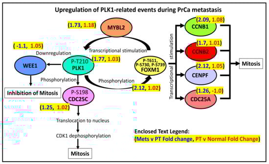 As illustrated in Figure 3, the components of the Reactome pathway PLK1-related events are predominantly upregulated in PrCa metastasis relative to PT (but not in PT relative to normal prostate tissues). In this signaling pathway, a PLK1 phosphorylated at threonine 210 (or P-T210) will activate the phosphatase CDC25C, which will then translocate to the nucleus. In the nucleus, the activated CDC25C will activate the cyclin B1/CDK1 complex, which will promote early mitotic events [44]. In contrast, PLK1’s phosphorylation of the CDK1-inhibitor WEE1 may serve as the latter’s signal for degradation [45]. In addition, PLK1 (P-T210) can also phosphorylate the transcription factor FOXM1, which will then upregulate the expression of various genes involved in G2 to M transition (CCNB1, CCNB2, CENPF, CDC25A, and PLK1). As shown in Figure 3, the elevated expression of the genes mentioned above is consistent with a more active PLK1-driven signaling pathway that eventually leads to an increased mitotic rate, which is likely what happens in metastasizing prostate cancer cells [32]. One exception is WEE1, whose expression is lower in metastatic compared to PT tissues. It makes sense since WEE1 has a mitotic inhibitory function, as explained above.