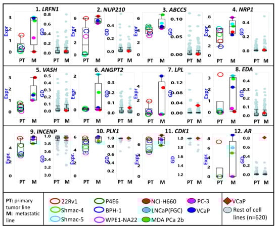 In Project Achilles, >800 cancer cell lines (n = 808, according to the 20Q4 data release) were subjected to a genome-wide CRISPR/Cas9 knockout screen [20,21]. The resulting sgRNA sequencing and cell viability data were then used to calculate the probability (P) that the knockout of a given gene (G) will affect the viability of a particular cell line (C). The PGC score (also referred to as “gene dependency” or GD) for 18,119 genes ranged from 0 (i.e., gene knockout did not influence cell viability) to 1 (i.e., gene expression is very vital to cell viability). The average GD scores (separately for 368 PT and 253 metastatic cell lines) for each of the top 300 PrCa metastasis-upregulated can be found in Table S2. As exhibited in Figure 4, the average GD scores for the potential PrCa metastasis diagnostic markers (e.g., the surfaceome genes LRFB1, NUP210, ABCC5, and NRP1, as well as the secretome genes VASH, ANGPT2, LPL, and EDA) are closer to 0 than they are to 1. It is also noteworthy that the average expression levels of the genes mentioned above are higher among metastatic compared to PT-derived PrCa lines. In contrast, the average GD scores for INCENP, PLK1, and CDK1 are close to 1. The expression levels of these genes are similarly higher in metastatic relative to PT PrCa cell lines. However, for the gene AR, a high gene dependency value (close to 1) is only evident in the PrCA line VCap, reflective of the gene’s unique role in PrCa progression.
