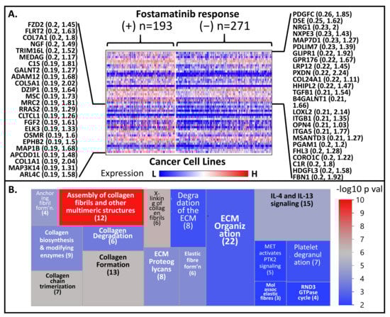 (A) Comparative heat map of expression of genes between relatively responsive (+) and non-responsive (–) against the serine-threonine kinase inhibitor fostamatinib. Only the genes with the highest signal-to-noise ratio (responsive vs. non-responsive) are shown. (B) A treemap representation of the Reactome pathways resulted when the top 150 PrCa metastasis-upregulated genes were used in the Reactome analysis. Only the top 16 pathways (the ones with the lowest Entities p values) are shown.