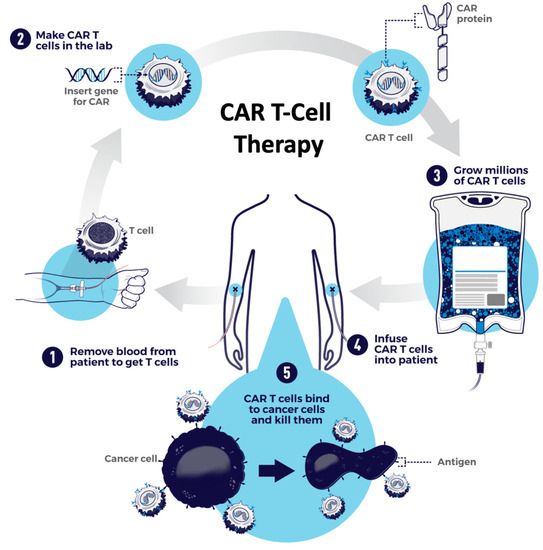 - Chong, E.A.; Ruella, M.; Schuster, S.J. Five-Year Outcomes for Refractory B-Cell Lymphomas with CAR T-Cell Therapy. N. Engl. J. Med. 2021, 384, 673–674. [Google Scholar] [CrossRef] [PubMed]