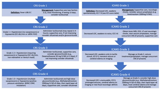 However, despite the notable efficacy and high remission rates observed in these pivotal studies, CD19 CAR-T therapies are also associated with unique and potentially life-threatening toxicities including cytokine release syndrome (CRS) and immune effector cell-associated neurotoxicity syndrome (ICANS). CRS is associated with elevated serum levels of pro-inflammatory cytokines, including interferon gamma (IFN-gamma), TNF, IL-6 and IL-10, which contribute to a systemic hyper-inflammatory syndrome characterized most commonly by fevers, hypotension and hypoxemic respiratory failure [33,34]. The pathophysiologic mechanism of ICANS is less well understood but may be related to underlying endothelial dysfunction and the leakage of elevated serum cytokine levels across the blood–brain barrier, resulting in an inflammatory encephalopathy [35]. Nevertheless, both immune effector cell (IEC)-associated toxicities present unique challenges for both clinical management and research development.