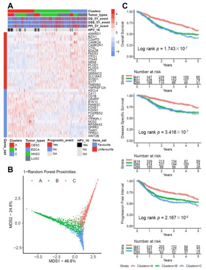 Consensus clustering of 1334 SCC cases based on the expression profile of 37 survival-related candidate genes revealed three robust clusters (Figure 1A and Figure S4), which were further supported by a random forest regression model for the pan-SCC cohort (Figure 1B). The SCC cases in cluster A (n = 444) were characterized by a higher expression of candidate genes related to a favorable survival, while cluster B (n = 602) and C (n = 288) shared a higher expression of candidate genes related to an unfavorable survival (Figure 1A). Moreover, cluster A was significantly enriched for HPV16-positive SCC as compared to cluster B and C (Chi-square test p value < 0.001).
