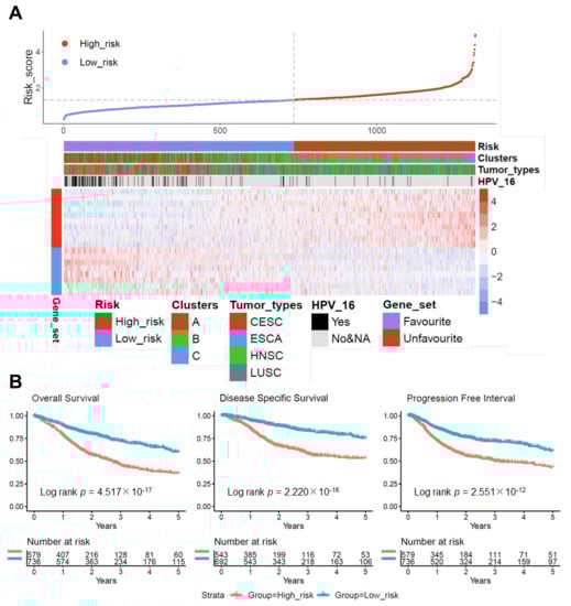 Most relevant prognostic candidate genes were prioritized by a LASSO Cox regression model concerning OS in 1315 cases of the pan-SCC cohort (Figure S8). The analysis revealed 18 prognostic candidate genes, of which seven were related to a favorable OS (RPS6KA5, EVA1C, FOXRED2, ITPRIPL1, TIAM1, FAM83C, and NOS2), and eleven were related to an unfavorable OS (BZW1, CTSL, TPRG1, ITGA5, SLC16A3, PTX3, CAMK2A, SERINC3, SUSD1, EDA2R, and TMEM92). The pan-SCC cohort was divided into high-risk (n = 579) and low-risk (n = 736) groups based on the risk score best cutoff by a log rank analysis. As expected, cluster A cases were strongly enriched in the low-risk group, while cluster B and C cases were enriched in the high-risk group (Figure 2A). Moreover, HPV-positive tumors and cases of the TCGA-CESC cohort were more abundant in the low-risk group (Figure 2A). Concerning the clinical outcome, the high-risk group of the pan-SCC cohort was associated with an unfavorable OS, DSS, and PFI as determined by a Kaplan–Meier analysis (Figure 2B), and univariate Cox regression models confirmed an unfavorable OS for most tested subgroups with a high-risk score (Figure S9). Moreover, univariate Cox regression models confirmed an unfavorable OS, DSS, and PFI for HPV16-positive and HPV-16 negative SCC with a high-risk score for TCGA-CESC or TCGA-HNSC, but not for HPV18-positive SCC of TCGA-CESC (Figure S10).