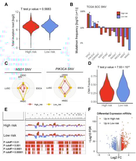 Differences in the mutational landscape among high-risk and low-risk subgroups of the pan-SCC cohort. (A) Violin plot demonstrates no significant difference for total mutation load among high-risk and low-risk subgroups of the pan-SCC cohort. (B) Bar plot summarizes the relative abundance of somatic mutations for significant MutSig genes (chi-square test p < 0.05) among high-risk and low-risk subgroups of the pan-SCC cohort. * chi-square test p < 0.001. (C) Graphs show the relative frequency of either NSD1 (left) or PIK3CA (right) somatic mutations for the indicated TCGA cohorts. (D) Violin plot demonstrates a significant higher global CNA fraction in the low-risk as compared to high-risk subgroup for the pan-SCC cohort. (E) CNA plot shows the relative frequency of copy number gains (red) or deletions (blue) among high-risk and low-risk subgroups of the pan-SCC cohort and displays highly significant differences by Fisher’s exact test. (F) Volcano plot presents significant differentially expressed genes (DEGs) (−1 > log2FC > 1, FDR < 0.05, n = 1081) among high-risk and low-risk subgroups of the pan-SCC cohort computed by edgeR.