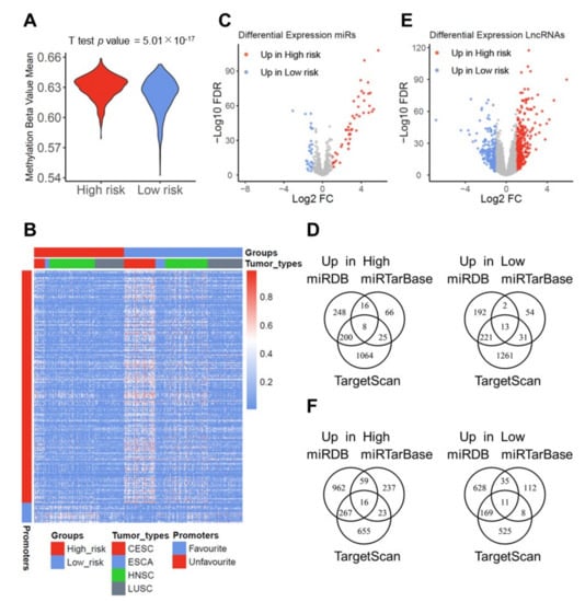 Differences in the epigenetic landscape among high-risk and low-risk subgroups of the pan-SCC cohort. (A) Violin plot demonstrates significant higher genome-wide beta mean values for promoter DNA methylation of the low-risk as compared to the high-risk groups in the pan-SCC cohort. (B) Heatmap shows beta values for differentially methylated probes (n = 231) annotated for promoters of DEGs among high-risk and low-risk subgroups of the pan-SCC cohort. (C) Volcano plot shows significant differentially expressed miRs (DEFMs, n = 78) among high-risk and low-risk groups of the pan-SCC cohort (−1 > log2FC > 1, FDR < 0.05). (D) Venn diagrams summarize the amount of predicted DEFM-DEG links according to indicated databases and miRs which are up-regulated in either high-risk (left) or low-risk (right) groups of the pan-SCC cohort. (E) Volcano plot shows significant differentially expressed lncRNAs (n = 513) among high-risk and low-risk groups of the pan-SCC cohort (−1 > log2FC > 1, FDR < 0.05). (F) Venn diagrams summarize the amount of predicted miR-DEG links according to indicated databases and based on miRs, which are linked to differentially expressed lncRNAs, which are up-regulated in either the high-risk group (left) or the low-risk group of the pan-SCC cohort.