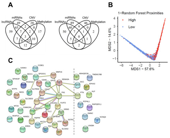 Candidate genes affected by different modes of genetic and epigenetic regulation. (A) Venn diagrams show the amount of DEGs with higher expression in either the high-risk (left) or the low-risk (right) group of the pan-SCC cohort, which are affected by different modes of indicated genetic (CNV) or epigenetic (Methylation, miRs, lncRNAs) events. (B) Random forest MDS plot presents distinct features of risk groups based on DEGs (n = 45), which are affected by three out of four genetic and epigenetic events. (C) Schematic presentation of a protein–protein interaction network (minimum required interaction score: medium confidence (0.400)) for selected DEGs (n = 45), which are affected by at least three out of four genetic or epigenetic events according to the STRING database.