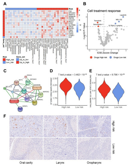 MEK inhibitors as potential drugs for high-risk SCC. (A) Heatmap demonstrates expression pattern of 16 survival-related candidate genes in indicated cancer cell lines with a low-risk or high-risk profile. (B) Volcano plot summarizes the relative change in the IC50 z-score and p-value among selected SCC cell lines with a low-risk or high-risk profile, which were treated with indicated compounds based on the Genomics of Drug Sensitivity in Cancer (GDSC) database. Red dots represent drugs with a significantly higher sensitivity for high-risk SCC cell lines and blue dots represent drugs with a significantly higher sensitivity for low-risk SCC cell lines. (C) Schematic presentation of a protein–protein and protein–chemical association network (minimum required interaction score: medium confidence (0.400)) for Trametinib and Selumetinib based on the STITCH database. (D,E) Violin plots demonstrate significantly higher ssGSEA scores for either ERK-MAPK or JAK-STAT3 signaling pathways in high-risk as compared to low-risk groups of the pan-SCC cohort. (F) Representative pictures of an IHC staining demonstrates prominent MEK1/2 phosphorylation (brown signal) in cancer cells of high-risk (upper row) but not in low-risk (lower row) HNSCC of the indicated subsites. Histological staining with hematoxylin to visualize the tissue architecture.