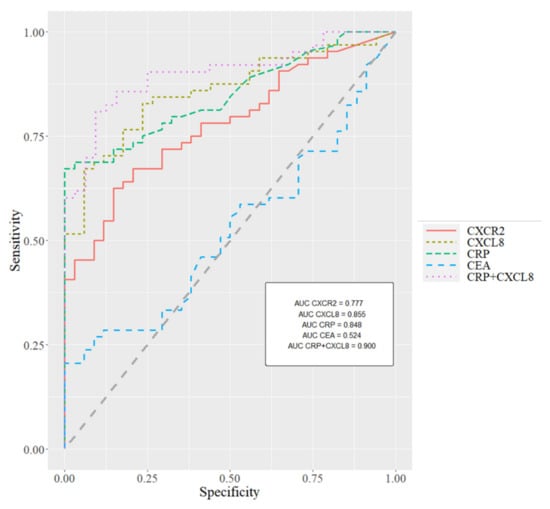 In order to select the optimal predicted probability cut-off values, Youden’s index was used. The reference cut-off values were as follows: 23.11 pg/mL for CXCL8; 1.15 ng/mL for CXCR2; 4.65 ng/mL for CEA; 5.59 U/mL for CA19-9; and 5.50 mg/L for CRP.