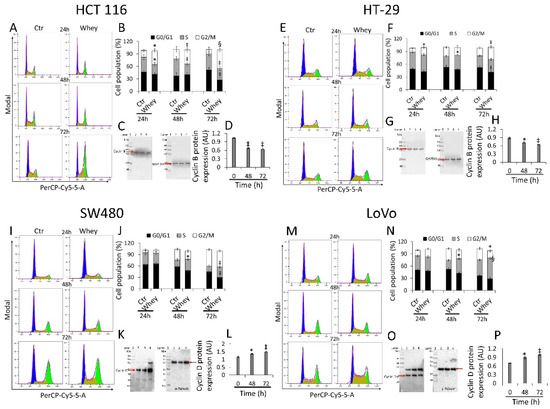 Similarly, HT-29 cell cycle analysis showed a block in G2/M phase, more consistent after 48 and 72 h of incubation with whey (16.6 ± 2.23 and 29.0% ± 4.01, respectively, vs. 9.03% ± 1.69 in Ctr, p < 0.01) (Figure 2E,F). As for HCT 116, downregulation of cyclin B expression levels was also detected (p < 0.01) (Figure 2G,H and Figure S2). On the other hand, SW480 showed an accumulation in S phase after 48 and 72 h (27.4 ± 3.56 and 30.1% ± 4.51, respectively, vs. 14.5% ± 2.78 in Ctr, p < 0.01) (Figure 2I,J) and a time-dependent accumulation of protein cyclin D (p < 0.01) (Figure 2K,L and Figure S2). Likewise, also the metastatic CRC cell line, LoVo, showed a consistent S phase accumulation after 48 and 72 h (35.5 ± 2.97 and 50.9% ± 4.25, respectively, vs. 22.3% ± 2.85 in Ctr, p < 0.001) (Figure 2M,N) and upregulation of cyclin D protein (p < 0.05) (Figure 2O,P and Figure S2). Whey treatment (40% v/v) up to 72 h did not perturbate the cell cycle in normal colon CCD 841 CoN cells (Figure S3), supporting the specificity of the effect for cancer cells.