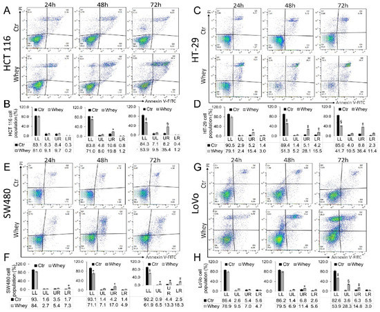Whey induces apoptosis in CRC cells. Representative dot plots and analyses of Annexin V-FITC and Propidium Iodide (PI)-stained (A,B) HCT 116, (C,D) HT-29, (E,F) SW480 and (G,H) LoVo cells. Cell lines were treated with HBSS-10 mM Hepes (Ctr) or whey 40% v/v for 24, 48 and 72 h and cell viability/death assessed by flow cytometry. Lower left (LL), viable cells; upper left (UL), necrotic cells; lower right (LR), early apoptotic cells; upper right (UR), late apoptotic cells. Data are expressed as mean ± SD of n = 3 experiments. At least 10,000 events were acquired. * p < 0.05 vs. Ctr; ‡ p < 0.01 vs. Ctr; § p < 0.001 vs. Ctr.