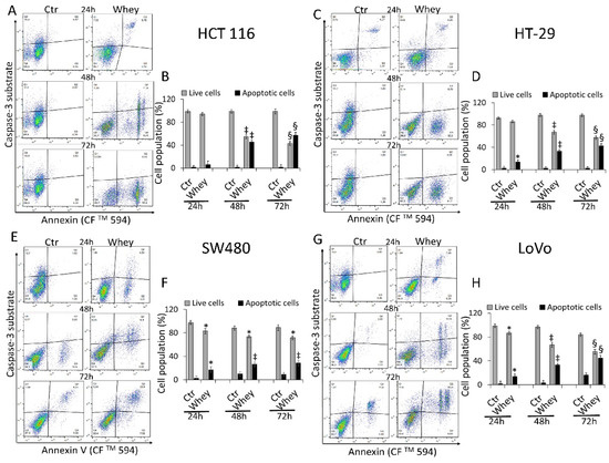 Whey mediates caspase-3 activation in CRC cells. Representative dot plots and analyses of caspase-3 activation in (A,B) HCT 116, (C,D) HT-29, (E,F) SW480 and (G,H) LoVo cells. Cells were treated with HBSS-10 mM Hepes (Ctr) or whey 40% v/v for 24, 48 and 72 h and cell population assessed by flow cytometry. Data are expressed as % of live or apoptotic population with mean ± SD of n = 3 experiments. At least 10,000 events were acquired. * p < 0.05 vs. Ctr; ‡ p < 0.01 vs. Ctr; § p < 0.001 vs. Ctr.