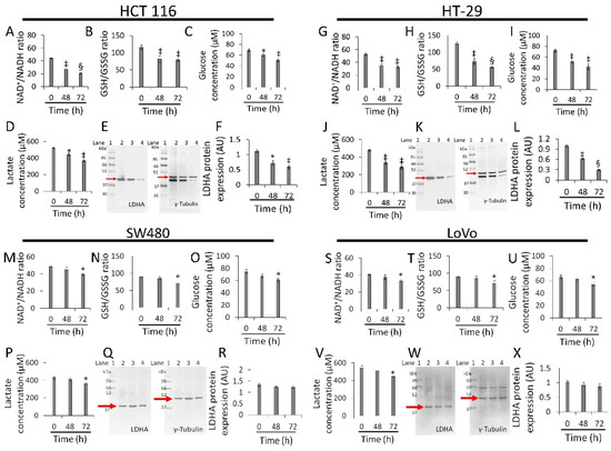 Whey affects energy metabolism in CRC cells. The effects of whey on NAD+/NADH, GSH/GSSG, glucose uptake, lactate production, and LDHA protein expression levels were detected on (A–F) HCT 116, (G–L) HT-29, (M–R) SW480 and (S–X) LoVo cells. Cells were treated with whey 40% v/v. Lane 1 = molecular markers; Lane 2 = 0 h; lane 3 = 48 h; lane 4 = 72 h. LDHA protein expression was determined, after normalization with γ-tubulin as internal control, with ImageJ software and values expressed as arbitrary units (AU). * p < 0.05 vs. 0 h; ‡ p < 0.01 vs. 0 h; § p < 0.001 vs. 0 h.