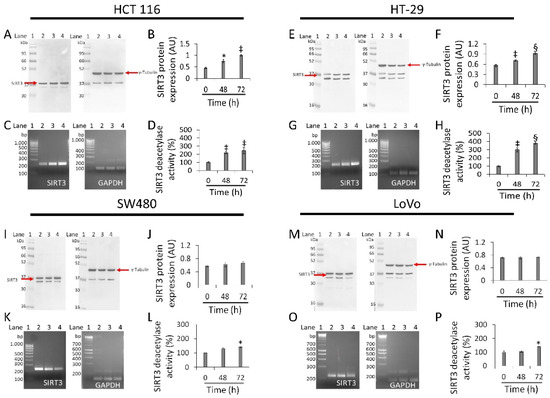 Antiproliferative effects of whey are mediated by SIRT3 modulation. SIRT3 protein, mRNA levels and enzyme activity were assessed on (A–D) HCT 116, (E–H) HT-29, (I–L) SW480 and (M–P) LoVo cells treated with whey (40% v/v). Lane 1 = molecular markers; Lane 2 = 0 h; lane 3 = 48 h; lane 4 = 72 h. SIRT3 protein expression was normalized against γ-tubulin and determined with ImageJ software and values expressed as arbitrary units (AU). For PCR products, SIRT3 mRNA levels were normalized against GAPDH internal control and the amplified transcripts are shown with the expected sizes on 2.0% agarose gels.* p < 0.05 vs. 0 h; ‡ p < 0.01 vs. 0 h; § p < 0.001 vs. 0 h.