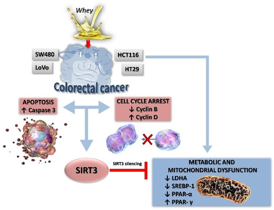 In this study, we provided evidence on the in vitro anticancer activity of whey on CRC cells by modulating SIRT3 and metabolic reprogramming. Whey treatment displayed cytotoxic, apoptotic and cycle modulating properties on LoVo, SW480, HCT 116 and HT-29 cells with higher effects on HCT 116 and HT-29 cells, reaching 50% of cell death. Of interest, whey acted differently on the distinct cell lines, although promoting antineoplastic effects. Indeed, in HT-29 and HCT 116 cells, whey determined a negative modulation of cyclin B, causing a G2/M phase accumulation, whereas in LoVo and SW480 cells upregulation of cyclin D, and G1/S cell cycle arrest were observed. Apoptosis occurred in all cell lines starting from 48 h of treatment with the highest efficiency observed in HCT 116 and HT-29 after 72 h of incubation. Moreover, LoVo and SW480 whey-treated cells undergone to necrosis process (Figure 9).