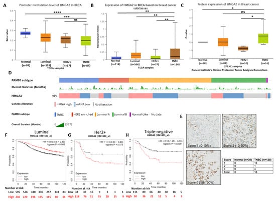 To investigate the gene promoter methylation status and expression level of HMGA2 in different breast cancer subtypes, we analyzed publicly available TCGA breast cancer datasets. This demonstrated that HMGA2 promoter methylation was significantly lower in the TNBC and HER2+ breast cancer tissues compared to luminal breast cancer tissues (p = 9.43 × 10−4) and normal tissues (p = 4.78 × 10−11) (Figure 1A). Accordingly, analysis of the RNA expression showed HMGA2 significantly increased in TNBC subclasses compared to Normal (p-Value = 2.76 × 10−3), luminal (p-Value = 4.94 × 10−3) and HER2+ (p-Value = 3.46 × 10−3) subclasses (Figure 1B). Besides, HMGA2 protein expression in breast cancer samples from the Cancer Institute’s Clinical Proteomic Tumor Consortium (CPTAC) showed that the HMGA2 protein levels were increased in TNBC samples compared to normal tissues (p < 0,05) (Figure 1C). HER2-positive breast cancers exhibited reduced HMGA2 levels, while no change was observed for the luminal subgroup. To confirm the HMGA2 mRNA expression in different breast cancer subtypes, we used the tab OncoPrint to analyze the data based on an invasive breast cancer (TCGA, Nature 2012) dataset. The result showed HMGA2 overexpressed in more than 50% samples in TNBC subtypes, however, in Luminal A and B subtypes are less (Figure 1D). The expression of HMGA2 proteins was assessed by immunohistochemistry on normal breast epithelium (i.e., normal adjacent tissue/hyperplasia; 30 tissues) and TNBC tissues (120 tissues) (Figure 1E and Supplementary Table S1). As expected, no staining was found in normal tissues. The HMGA2 staining in tumors was scored according to the number of positive cells. Out of 18 tissues, 13 were in score 1 (0–10% positive cells), 1 was in score 2 (10–50% positive cells) and 4 were in score 3 (50–100%) (Figure 1E). This analysis confirmed that HMGA2 is induced in expression in TNBC compared to normal breast epithelial. It also demonstrated that HMGA2 expression is highly heterogeneous in TNBC tumors. Importantly, Kaplan Meier survival plots revealed a correlation between high HMGA2 expression and increased overall survival in the luminal subclass (HR = 0.65, log rank p = 0.006) (Figure 1F), whereas high HMGA2 expression tended to be associated with decreased survival in HER2+ patients (HR = 1.74, log rank p = 0.075) (Figure 1G) and was significantly associated with decreased survival of TNBC patients (HR = 2.18, log rank p = 0.004) (Figure 1H). These results suggested a specific role for HMGA2 in oncogenesis of TNBC patients.