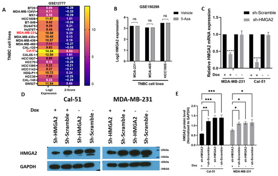 Stable knockdown of HMGA2 expression in TNBC cell lines. HMGA2 mRNA expression level from GSE12777 dataset showing HMGA2 expression in TNBC cell lines (A). HMGA2 expression after 5-Azacytidine treatment from dataset GSE150298 did not show changes after treatment in any of MDA-MB-468, MDA-MB-231 and HCC1860 cell lines (B). MDA-MB-231 and Cal-51 TNBC cell lines were stably transduced with plasmids encoding a doxycycline-inducible HMGA2 specific shRNA (shHMGA2) or a scrambled shRNA (shScrambled). Treatment of the cells with 1 µg/mL doxycycline (Dox) to induce expression of HMGA2 shRNAs decreased HMGA2 mRNA (C) and protein (D,E) levels. The results are shown as mean ±SD (n = 3) of shHMGA2 versus the shScramble group, * p < 0.05, ** p < 0.01, *** p < 0.001, **** p < 0.0001 by t-test.
