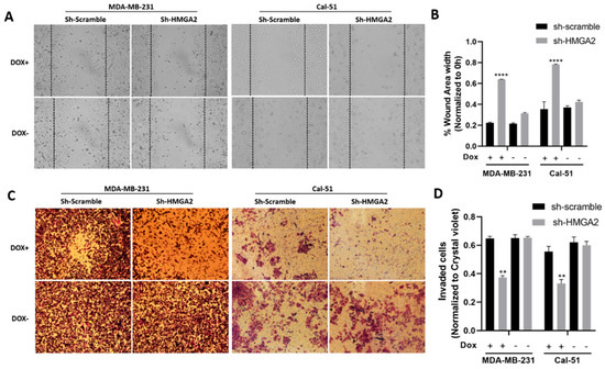HMGA2 silencing decreases the invasion and migration of TNBC cells. Micrograph showing reduced invasion of HMGA2-silenced TNBC cells compared to corresponding TNBC control cells (A). The number of HMGA2-silenced migrated cells were quantified and compared to shScramble cells for both MDA-MB-231 and Cal-51 cell lines after 48 h treatment with or without doxycycline (Dox) (B). Micrograph showing that HMGA2-silenced TNBC cells exhibit reduced invasion (decreased cell migration into the wound gap area) compared to corresponding TNBC control cells (Magnification, ×20) (C). The wound area width was quantified and compared to that of shScramble cells for both cell lines (D). The results are shown as mean ± SD (n = 3) versus shScramble cells, ** p < 0.01, **** p < 0.0001 by t-test.