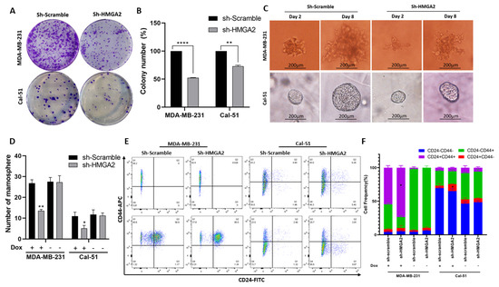 We also investigated the effect of HMGA2 silencing on the cancer stem cell characteristics of MDA-MB-231 and Cal-51 TNBC cells. The ability to form colonies was significantly decreased in cells with HMGA2 silencing compared to cells with non-targeting control (Figure 5A,B). In addition, the sizes and numbers of mammospheres were diminished in HMGA2-silenced TNBC cell cultures compared to corresponding scrambled transduced control cell cultures (Figure 5C,D) in both the MDA-MB-231 and Cal-51 cell models. The population of CD44+CD24+ increased significantly in MDA-MB-231 shHMGA2 group (p-Value < 0.05), in contrast with the population of CD44-CD24+, which significantly increased in the Cal-51 shHMGA2 group compared to the scramble group (p-Value < 0.05) (Figure 4E,F) indicating that HMGA2 supports key cancer stem cell features of TNBC. However, these results should be interpreted with caution since CD44 expression was also affected in controls (i.e., cells with doxycycline treatment/induction of scrambled shRNA).