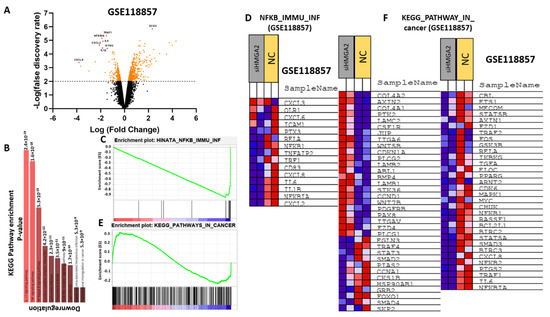 HMGA2 expression correlates with NF-kB signaling in TNBC. Comparative expression profiling of MDA-MB-231 cells treated with HMGA2-specific siRNA or scramble was analyzed using data from GSE 118857. A volcano plot of differentially expressed (DE) mRNAs, adjusted for fold-change>2 and p < 0.01, between HMGA2 siRNA treated and negative control (Mock) treated cells (A). Gene enrichment showed significant alteration of the NF-kB signaling pathway upon HMGA2 silencing (p = 8.9 × 10−8) (B). Gene set enrichment analysis (GSEA) showed that NF-kB (C,D) and Cancer pathway (E,F) gene sets were specifically enriched among the genes differentially expressed between the HMGA2-silenced and scramble groups.