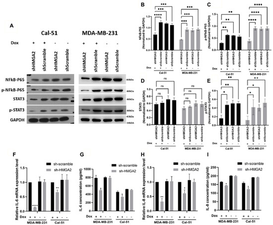 HMGA2 silencing decreased activation of NF-kB/IL-6/STAT3 signaling. Western blotting showed that doxycycline (Dox)-induced HMGA2 silencing (shHMGA2) decreased both NF-kB-p65 (A,B), p-NF-kB-p65 (A,C) and p-STAT3 (A,E) but not STAT3 (A,D) protein levels. In addition, HMGA2 silencing decreased IL-6 (F,G) and IL-8 (H,I) in both the mRNA and protein levels (n = 3). * p < 0.05, ** p < 0.01, *** p < 0.001, and **** p < 0.0001 by t-test versus the shScramble group.