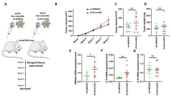 Based on the above results, we speculated that HMGA2 expression might affect TNBC tumor formation. To test this, we implanted Cal-51 cells with doxycycline-inducible expression of HMGA2-specific or non-targeting shRNA in the mammary fat pad of NOG mice (n = 8 per group) and provided doxycycline in the drinking water. Tumor sizes were measured weekly for 5 weeks (Figure 8A) and upon resection after the mice were sacrificed. Although there was no statistically significant difference between the groups with and without HMGA2 knockdown, there was a tendency towards tumors with reduced HMGA2 levels being smaller (Figure 8B–D). Knockdown of HMGA2 in the tumors with HMGA2 shRNA expression was confirmed with qPCR (Figure 8E). Interestingly, IL-6 expression was highly reduced in the HMGA2 knockdown tumors (Figure 8F), confirming our in vitro results. No significant difference in IL-8 mRNA levels between the two groups was observed (Figure 8G).
