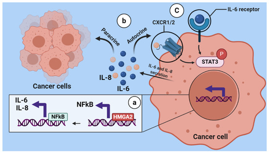 Schematic illustration of regulation of HMGA2 on the NF-κB/IL-6/IL-8/STAT3 axis. HMGA2 as DNA binding protein increases the expression of NFkB, then NFkB increases the secretion of IL-6 and IL-8 from breast cancer cells (a). IL-6 and IL-8 which are released from tumoral cells can bind to their receptor in an autocrine and paracrine manner (b). Subsequently, this binding causes STAT3 signaling activation (C).