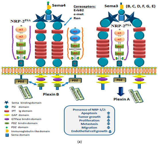 Comparable to NCAM-1 and NCAM-2, the function of polysialylated NRP-2 and its proteoglycan coreceptor NRP-1, which promote binding of the class 3 semaphorins (SEMA3) to their receptor plexinA/B, involves axonal guidance and growth suppressive properties in tumor cells [86,87,88] (Figure 2a). SEMAs were first described as negative mediators of axon pathfinding that repel axons and collapse growth cones [89,90]. Similar to this mechanism, SEMA3F is able to prevent the angio-invasion of tumor cells by repelling epithelial cells [91,92]. This is achieved when SEMA3 forms a complex with both Plexin and NRP-1/-2 [93,94,95]. Besides inhibiting the invasion of blood vessels, the formation of this complex induces a signal, which results in a higher apoptosis rate and further confines cell growth, migration, metastasis, and angiogenesis [91,92,96,97,98]. As SEMA3s and VEGFRs share the same ligands (NRP-1/NRP-2), the binding of SEMA3s constitutes a competitive inhibition of VEGFR binding and thus a negative effect on tumor progression [99,100] (Figure 2a,b).