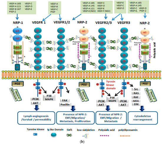 (a) Polysialylated glycoproteins or proteoglycans have a regulatory function in neuronal development. Association of multifunctional, polysialylated glycoproteins (e.g., NRP-2) or proteoglycans (e.g., poly-glucosaminylated NRP-1) with growth factor receptors (e.g., plexins) regulates several functions in neuronal cell development including apoptosis (induction), proliferation (inhibition), and migration (inhibition). Shown are the intra-, transmembrane-, and extracellular domains, as well as potential glycosylation sites (PSA). (b) Polysialylated glycoproteins or proteoglycans regulate various functions in association with growth factor receptors in tumor cells. Association of multifunctional, polysialylated glycoproteins (e.g., NRP-2) or proteoglycans (e.g., polyglucosaminylated NRP-1 with growth factor receptors (e.g., VEGFR1/2/3) modulates tumor progression/immune escape. Complex formation by polysialylated neuropilin receptor NRP-2 and its co-receptor NRP-1 with VEGF receptor via galectin induced stabilization of the complex will foster tumor progression and immune escape. Ligands of the various receptors/complexes are listed in the green boxes above the transmembrane proteins. Their signaling results in effects as shown in the boxes below the respective proteins. The respective signals lead to changes in cell survival, lymph-angiogenesis, migration, cytoskeleton rearrangement, invasion, EMT, and metastasis, as indicated in boxes below the lipid membrane. These interactions are crucial for vascularization and angiogenesis. Finally, galectin-1 interacts with neuropilin-1/vascular endothelial growth factor-2 (NPR-1/VEGFR-2) complexes to advance endothelial cells migration.