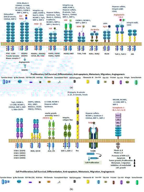 In this way, NRP1 and 2 interact with SEMA3 membrane-associated receptors located in the central nervous system (plexins) and their growth factors (class 3 semaphorins) [101,102,103]. In addition, they bind to a series of growth factor s and their receptors, including VEGF/VEGFR [75,76,104,105,106], TGF-β1/TGFβ1R [107,108], HGF/c-Met [109,110], PDGF/PDGFR [111,112,113], FGFs/FGFR [112,114,115,116,117], EGF/EGFR, BDNF/TRKA,B [118] as well as IGF/INSR [119]. These interactions favor the growth of potential tumor cells (Figure 3a,b).