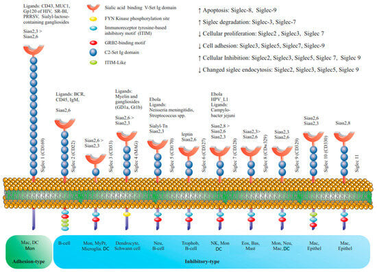 Siglec-1 (sialoadhesin), which lacks tyrosine-based motifs, plays a role as a positive regulator of the immune system and is a target for sialylated bacteria, enveloped viruses (e.g., HIV), and other sialylated pathogens [177,178].