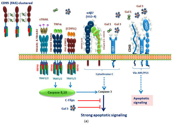 Galectins (S-type lectins) can induce apoptosis, autophagy, and cluster formation of glycoproteins [140,219]. They specifically bind to β-galactosides, such as N-acetyl-lactosamine (Galβ1-3GlcNAc or Galβ1-4GlcNAc), which is linked by N- or O- glycosylation, but this interaction is impeded by increased sialylation of the corresponding glycoproteins present on tumor cells, which reduce their interaction. Other apoptosis-inducing lectins include, e.g., C-type lectins and annexins [162]. Galectins have three different forms, including dimeric (homodimeric galectin 1, 2, 5, 7, 10, 11, 14, 15), tandem (heterodimeric galectin 4, 6, 8, 9, 12), or chimeric structures (galectin-3 exists in monomeric form or, associated via the non-lectin domain, in a pentameric complex). Their stability and ability to bind carbohydrates depends on disulphide bonds. Galectins have a broad variety of functions, including mediation of cell–cell interactions, cell–matrix adhesion, and transmembrane signaling for, e.g., apoptosis regulation [219,220,221]. Galectins participate in controlling the positive and negative selection of T cells in the thymus, as they prevent the circulation of T cells, which would recognize self-antigens by interacting with, e.g., CD43, CD45, or CD7 and then become self-reactive [222,223,224]. Following an immune response to eradicate the excess T cells, epithelial thymic cells secrete both galectin 1 [225,226] and galectin 9, thereby mediating apoptosis in activated or infected T cells [227,228]. Interaction of apoptosis inducing glycoproteins (e.g., CD43, CD 45, CD7, etc.) with galectin 1, galectin 3, or galectin 9 will further initiate different intracellular death pathways (Figure 5a,b) [229,230,231].