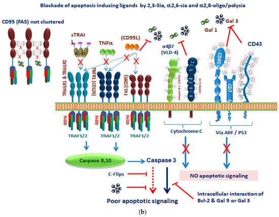 TNFα and FasL, the ligands for TNFR1, TRAILR, and Fas, are mainly expressed by immune cells, which are also a rich source of galectins. The latter are characterized by their binding to receptors (e.g., CD43, CD7, CD29, CD45, and others), which can also induce apoptosis [230,245] (Figure 6a,b). This outcome, however, is prevented in tumor cells as they express sialoproteins or gangliosides, which protect cancer cells from immune effector cells via interaction with inhibitory receptors (e.g., siglecs).