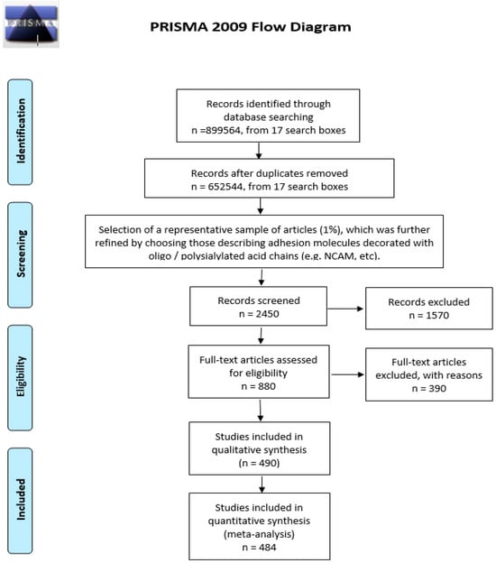 Records were identified by searching the PubMed database for keywords within the period of 1995–2021, which have been listed in the respective supplementary file (File S1). The original number of records was reduced by subtracting duplicates, which was followed by selecting those records that focus on the role of sialic acids (especially of poly- and oligo sialic acids) in various biological processes. The final selection was made by concentrating on those records that describe the role of adhesion molecules decorated with poly- and oligo sialic acids that play an important function in embryonal and neuronal development and can be re-expressed on tumor cells for immune escape.