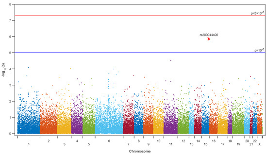 The genotype frequencies in all patients according to pathological Gleason score (cut-off—Gleason score 8) were analyzed using a logistic regression model, and the data are presented in Figure 1 (Manhattan plot). The results from genotyping with 242,186 SNPs by exomic array revealed that 4 SNPs (rs200944490 in Chromosome (Chr) 15, rs117555780 in Chr 11, rs34625170 in Chr 1, and rs61754877 in Chr 3) were significantly associated with high pathological Gleason score (≥8) after RP within cut-off level to p < 10−5 (Table 2). All four SNPs were strongly positively associated with high Gleason scores; odds ratios ranged from 1.759 to 6.459.