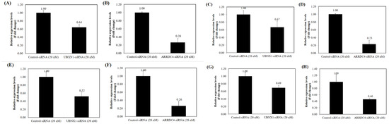 siRNAs targeting UBXN1 and ARRDC4 were used to knockdown the expression of these genes in prostate cancer cells. After transfection with UBXN1 and ARRDC4-siRNA in various PCa cell lines (PC3, DU145, LNCaP, and 22Rv1), real-time PCR was conducted to validate the effect of siRNA on the expression levels of endogenous UBXN1 and ARRDC4. As expected, UBXN1 and ARRDC4-siRNA significantly decreased endogenous expression of UBXN1 and ARRDC4 levels compared to the negative control-siRNA transfected cells (Figure 2), demonstrating transfection effectiveness and on-target action of these siRNAs.