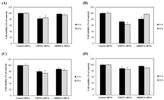 Following transfection, cell viability was evaluated by CCK-8 assay (Dojindo Molecular Technologies, Gaithersburg, MD, USA). Cells were seeded in 96-well plates and transfected with control, UBXN, or ARRDC4 siRNAs. After 24 and 48 h of incubation, viability of transfected cells was measured by CCK-8 assay. CCK-8 solutions were added to wells followed by incubation for 4 h. The absorbance value at 450 nm was detected using a microplate reader (Molecular Devices, Sunnyvale, CA, USA).