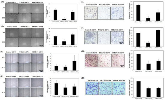 Knockdown of UBXN1 and ARRDC4 inhibits prostate cancer cell migration in PC3 (A), DU145 (B), LNCaP (C), and 22Rv1 cells (D) and invasion PC3 (E), DU145 (F), LNCaP (G) and 22Rv1 cells (H). Each cells were transfected with siRNA-targeted UBXN1 and ARRDC4 or its negative control. Cell migration and invasion were measured by wound-healing assay. Data are the average of at least three independent experiments. * p < 0.05 compared to negative control. Scale bar: XXX.