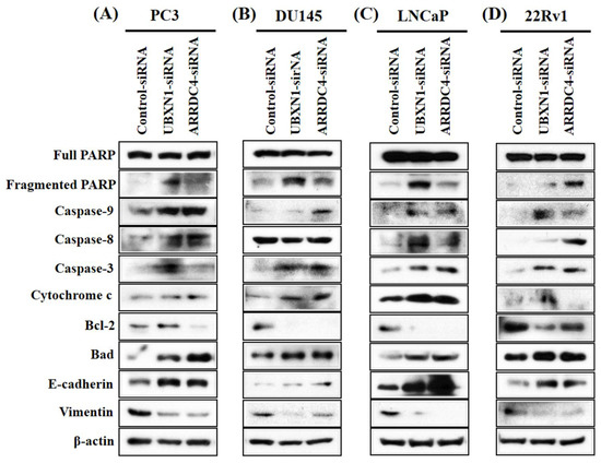 The apoptosis-related genes, cleaved caspase-3, -8, -9, fragmented PARP, cytochrome c, and bad were quantified by Western blot. The levels of cleaved caspases-3, -8, -9, fragmented PARP, cytochrome c, and bad were obviously increased following UBXN1-siRNA transfection compared to the negative control (Figure 5). However, the expression of the apoptosis-associated genes in PCa cells transfected with ARRDC4-siRNA were slightly enhanced or not changed. Since epithelial-to-mesenchymal transition (EMT) actively relates to the invasion and metastasis of cancer cells [16,17], the expression of EMT markers such as vimentin and E-cadherin in PCa cells following knockdown of UBXN1 and ARRDC4 was characterized. Reduced expression of UBXN1 and ARRDC4 in PCa cells resulted in down-regulation of vimentin (an important mesenchymal marker), and upregulation of E-cadherin (commonly used epithelial marker) compared with negative control-siRNA-transfected cells.