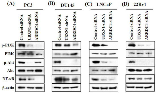 Knockdown of UBXN1 and ARRDC4 inhibits PI3/Akt/NF-kB pathway in prostate cancer cells. PC3 (A), DU145 (B), LNCaP (C), and 22Rv1 cells (D) were transfected with siRNA targeted UBXN1 and ARRDC4 or its negative control. The expression of protein was detected by Western blot analysis.