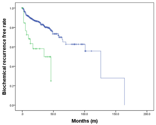 During a median follow-up of 58 months, 130 patients had experienced biochemical recurrence (BCR). Five-year BCR-free survival rate was achieved 24.9% in patients with variants and 69.9% in patients without (log rank test p < 0.001) (Figure 7)