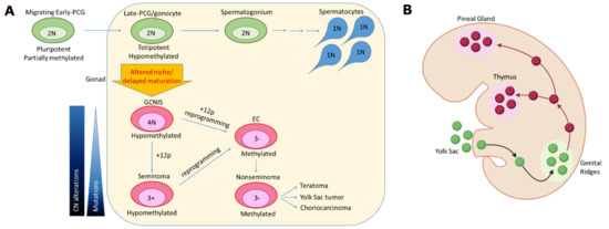 Origin of GCTs. (A) Schematic representation of TGCT development starting from early migrating PGCs during embryonal growth. PGCs start their epigenetic reprogramming and migrate from the yolk sac to the genital ridges. Once they have reached their niche, PGCs finish their epigenetic reprogramming through a global hypomethylation, and become gonocytes. Normally, gonocyte are diploid (2N) and differentiate in spermatogonium, which will give origins to spermatocytes (1N) after puberty. In the pathological setting, late-PGCs or gonocytes can double their genome (4N) and initiate a precursor lesion, defined as GCNIS. GCNIS, through the accumulation of additional copy number (CN) alterations (including gain of chromosome 12p), will then give origin to seminoma tumors after puberty. GCNIS and seminoma cells could also de-differentiate into ECs, through epigenetic reprogramming. ECs are characterized by a methylated genome, similar to embryonal stem cells, and have the pluripotency to give rise to the nonseminomatous histologies. Somatic mutations are scarce, acquired in the later steps of tumor progression. (B) Schematic representation of the migratory process of PGCs during embryonal development. Green and red dots represent respectively PGCs correctly migrating to the genital ridge and PGCs mismigrating and proliferating into the surrogate niches of the thymus or of the midline of the brain.