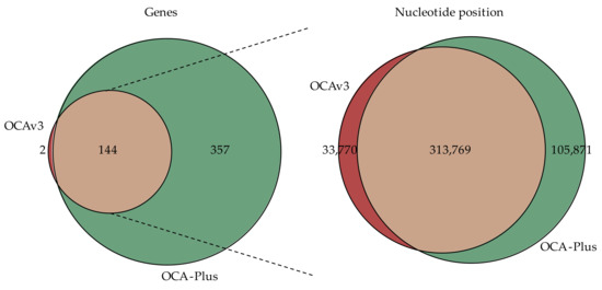 Latest versions of Browser Extensible Data (BED) files for OCA-Plus (file version: 20191203) and OCAv3 (file version: 20180509) available on the Ion Reporter™ Software (v. 5.14). Intersecting genes were identified using gene-id from both BED files and subsequently used as a filter only to filter variants within the list of intersecting genes. A list of intersecting genes and genes unique to OCAv3 and OCA-Plus is outlined in Table S1. From the BED file of OCAv3, the assay was found to cover 146 genes with the requirement of DNA for analysis. The OCAv3 is set to cover 161 genes; nevertheless, the fusion genes ERG, ETV1, ETV4, FGR, JAK2, MYB, MYBL1, NOTCH4, NRG1, NUTM1, PRKACA, PRKACB, RELA, RSPO2 and RSPO3 were not included in the BED file of OCAv3. We have subjected DNA for this comparative analysis. Therefore, the analysis of the latter mentioned fusion genes were not examined nor included, thus requiring RNA as input and the corresponding BED file for the fusion genes. Specific covered locus positions were obtained from BED files using the provided amplicon description of start and end position. Every position between start and end was extracted, and overlapping locus positions were applied as an additional filter to assure that genes and additional locus position could be rightfully compared during analyses.