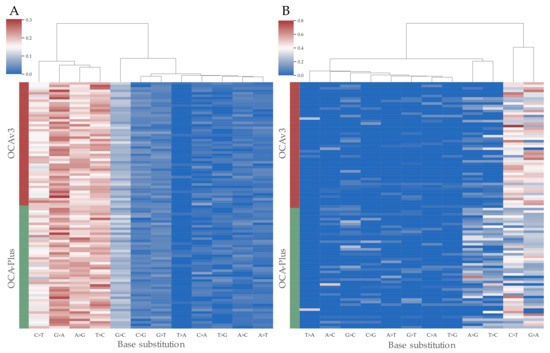 Potential sequence artifactual mutations are harbored in variants below the first quartile of mean sample allele ratios. (A) Cluster map of proportional base substitutions in variants above the first quartile. (B) Cluster map of proportional base substitutions in variants below first quartile of allele ratio. OCA-Plus harbored statistical lower levels of C > T and G > A but also significantly higher levels of A > G and T > C substitutions.