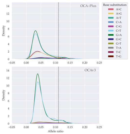 To define an adequately lower allele ratio threshold dealing variants with C > T or G > A substitutions, we examined at which point the allele ratio fluctuated. Kernel density estimation revealed a clear peak of C > T and G > A transitions around an allele frequency of 5% (Figure 3). The density of C > T and G > A shows a higher yield in OCAv3 samples; thus, this is expected as samples were not treated with UDG. Based on these observations we defined a threshold of 11% in accepted allele ratio for variants that had an allele ratio below the first quartile. Small peaks around an allele ratio of 0.13 were observed for both assays (Figure 3), however these peaks harbored low density compared to their respective parent peaks and therefore were considered as insignificant noise for further analysis.