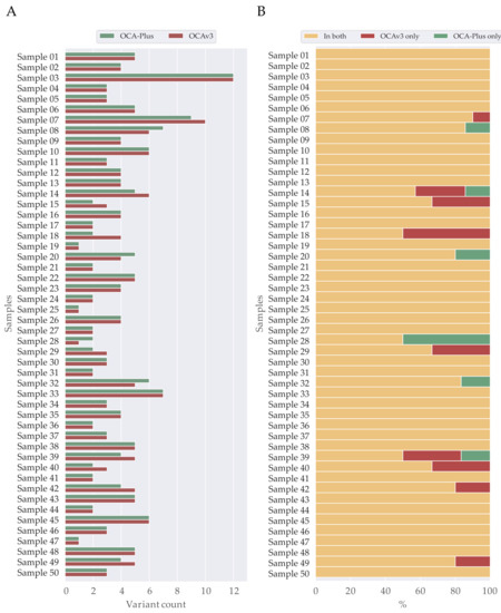Counts and overlap of identified variants in OCAv3 and OCA-Plus. (A) Bar-chart showing locus variants count per samples. (B) Stacked bar-chart of percentual overlapping locus variants of OCAv3 and OCA-Plus per samples; 37/50 samples overlapped completely and 13/50 showed difference in locus variants, hence only identified in one of the assays.